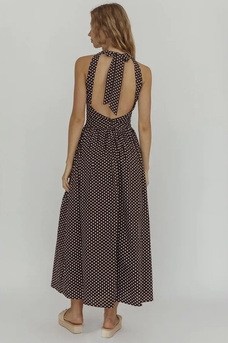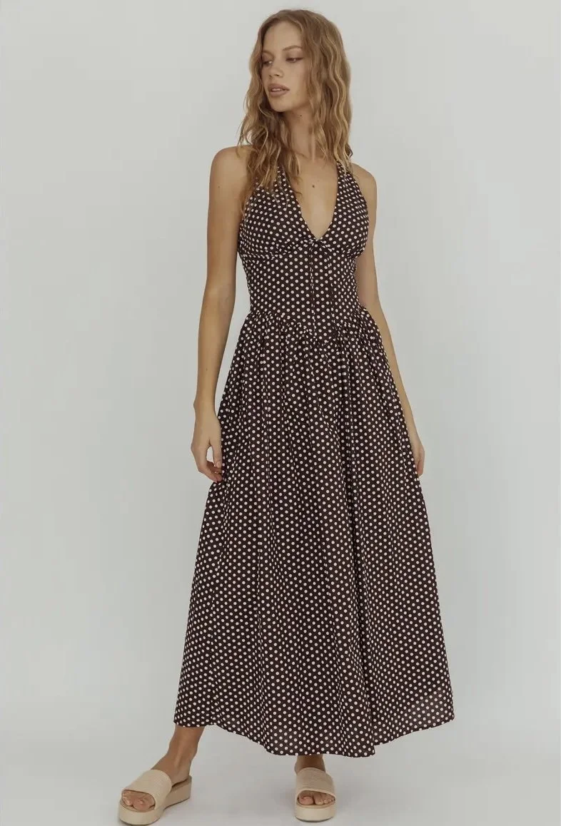 The Julia Dress (… Pretty Woman… duh) offers a maxi length, sleeveless style, with a halter tie, and deep v neckline with a self tie detail.